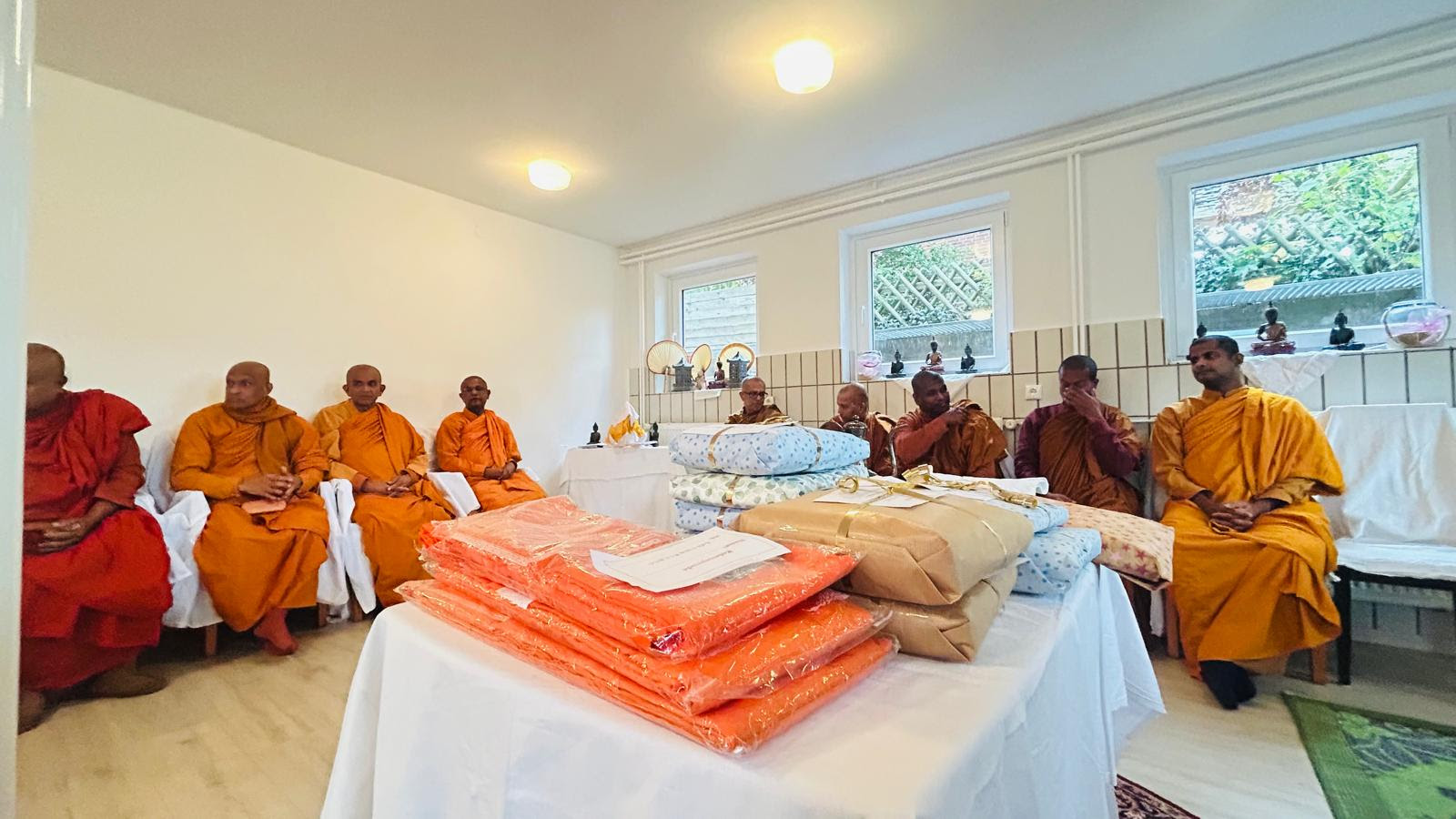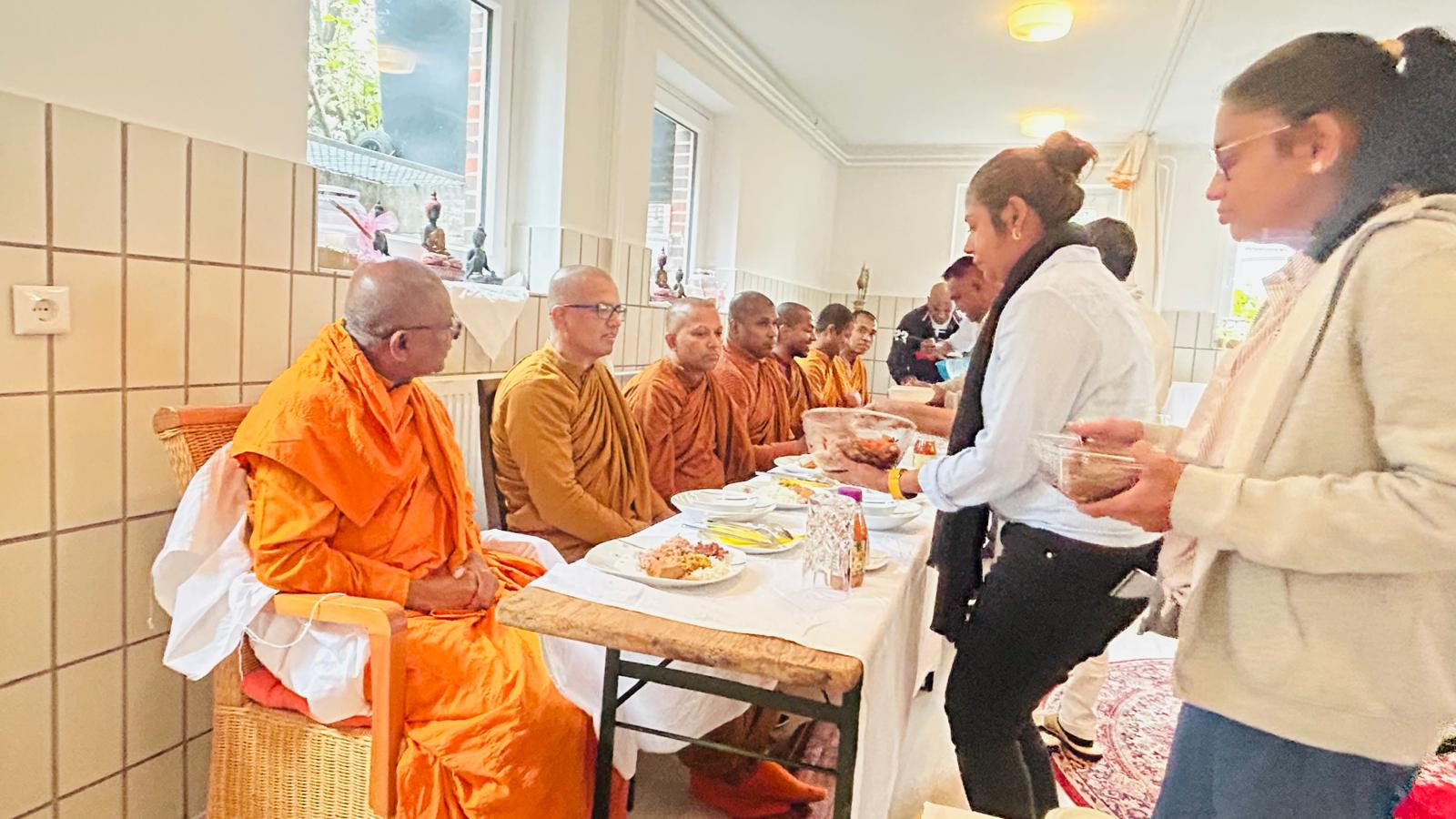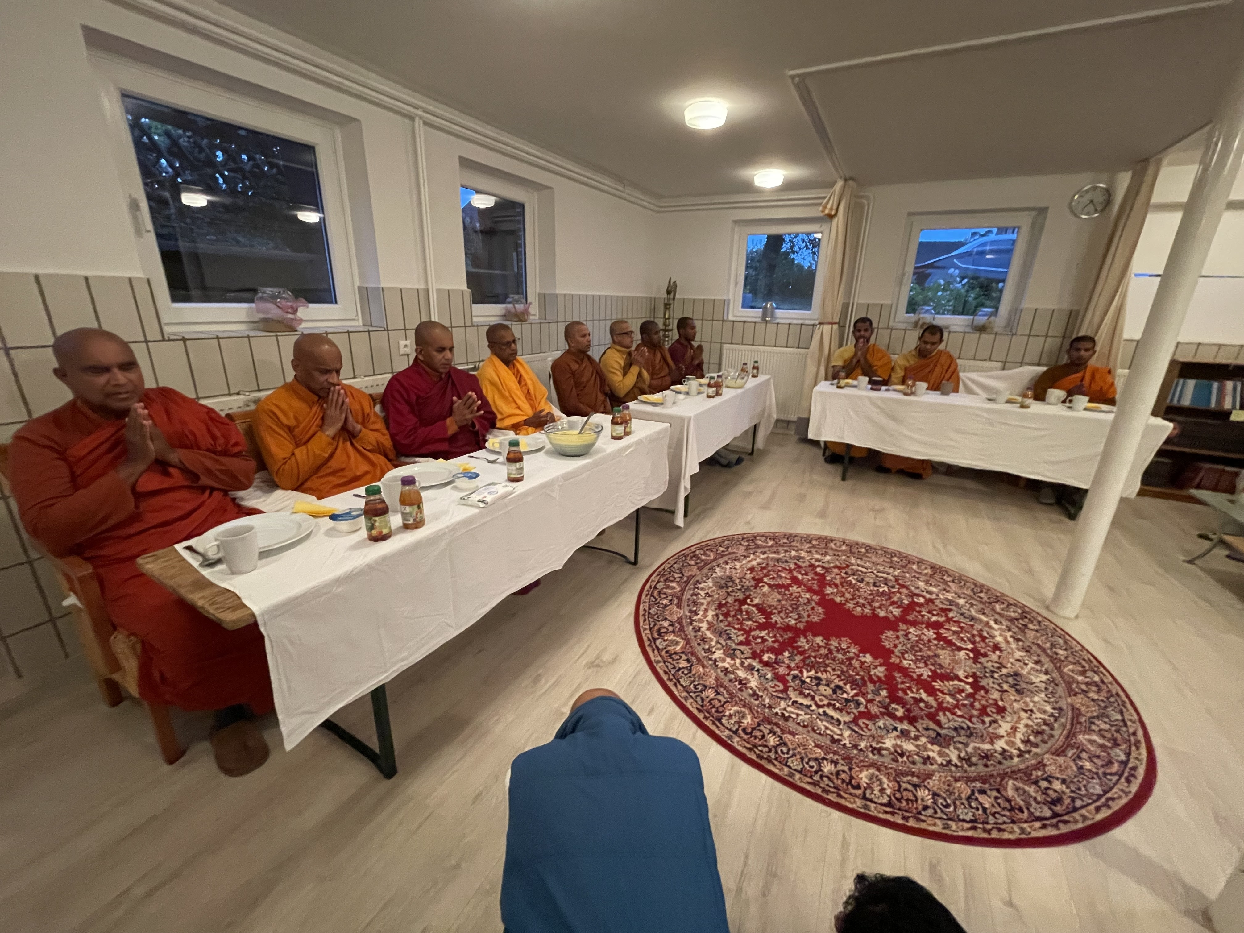 Dana für die insgesamt 12 voll-ordinierten Mönche, aus verschiedenen europäischen Ländern angereist, und ein reichhaltiges Buffett für alle Gäste. Nach einer kurzen Pause begann die Hauptfeierlichkeit mit Dhamma-Vorträgen und der feierliche Spende der neuen Roben an die Mönche. Eine Segnung schloss die Feierlichkeiten ab, mit Tee und Kaffee konnten alle Gäste gemütlich die gemeinsame Zeit ausklingen lassen. Wir freuen uns sehr über die Teilnahme aller Gäste.